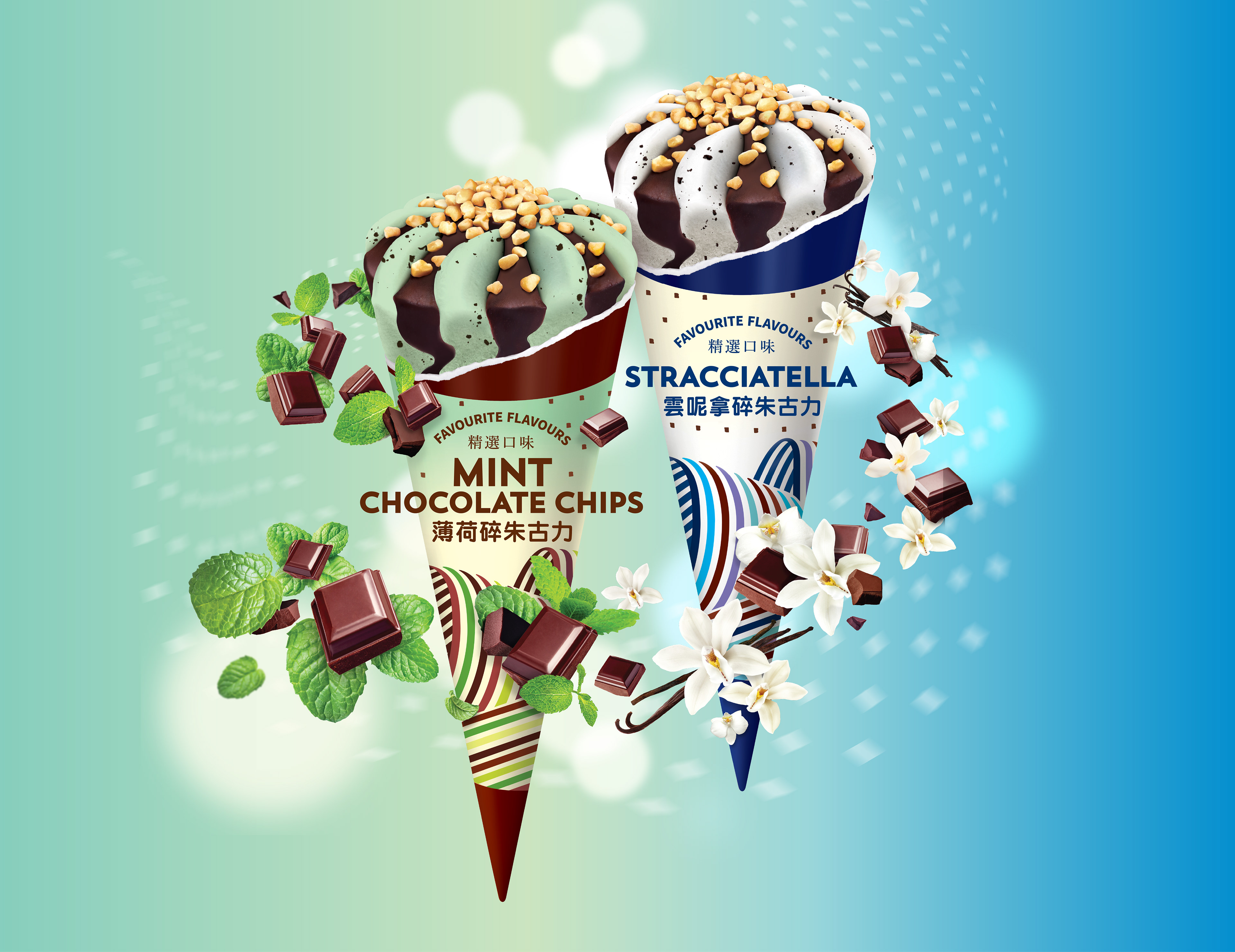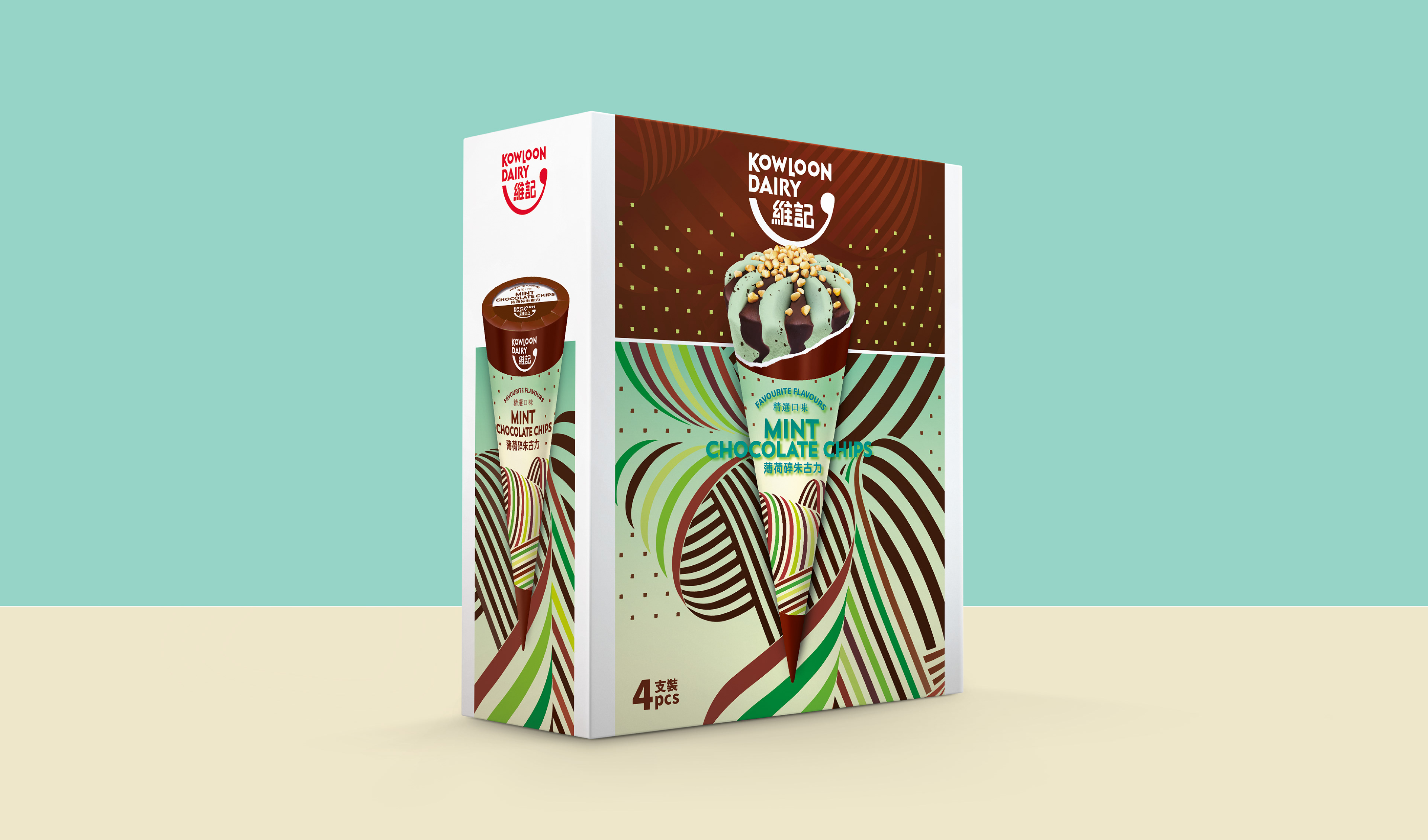 The brief for redesigning Kowloon Dairy’s ice cream packaging was to create an image expressing the high quality of the product and to reposition it as a local premium brand. The new packaging design had to blend in with the overall re-branding for Kowloon Dairy. Several visual directions were explored, with the ‘swirls’ concept selected — an evolution of the milk packaging rainbow stripes into swirling patterns suggesting the texture and richness of ice cream. The visual theme was applied to packaging for ice cream cones and cups and for Kowloon Dairy ‘limited edition’ ice creams in seasonal flavors.